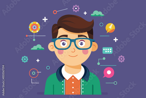 An illustration of a smiling nerd boy with glasses surrounded by technology icons, Nerd Customizable Disproportionate Illustration