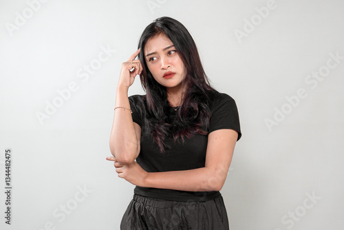 An Indonesian woman with long black hair wearing a black outfit, expressing confusion and deep thought. She touches her temple with a thoughtful and serious look.