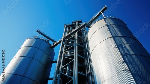industrial, grain, clear, blue, sky, highlighting, its, massive, scale
