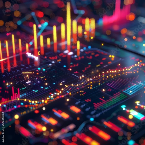 An intricate 3D visualization of a financial market dashboard