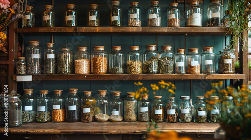 inviting, shop, interior, shelf, lined, glasses, jar, dried, herb, natural, remedy, handwritten, label