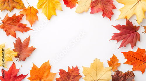 An inviting autumn frame of maple leaves in shades of red, yellow, and orange encircles a pristine white background. Each leaf’s details, from the veins to the subtle color gradients, create a warm,
