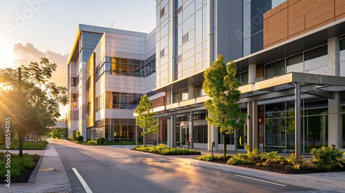 An inviting hospital facade, featuring a blend of materials and colors that evoke a sense of serenity.