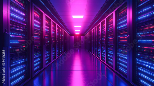 An isometric view showcases a server room and big data processing concept, featuring a datacenter and digital information technology against a neon dark gradient background.