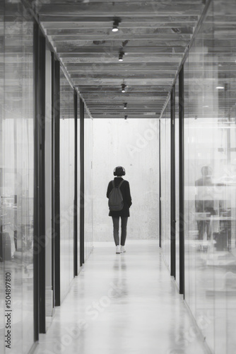 An office corridor with steel beams and glass walls on one side A worker walks slowly with headphones in and a backpack on