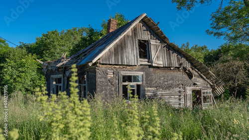 An old abandoned farmhouse. Broken windows. Broken roof.