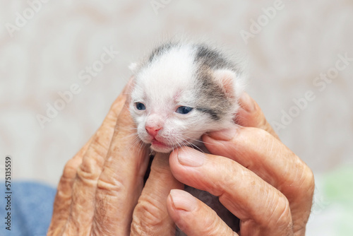 An old grandfather holds a small cute kitten in his hands. Love for animals