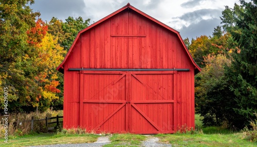 An old weathered red wooden barn stands as a rustic agricultural structure amidst a green rural field under a vast countryside sky