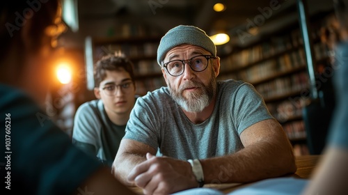 An older man with glasses and a beanie engages in a conversation in a library, projecting wisdom and a gentle disposition among shelves of books.