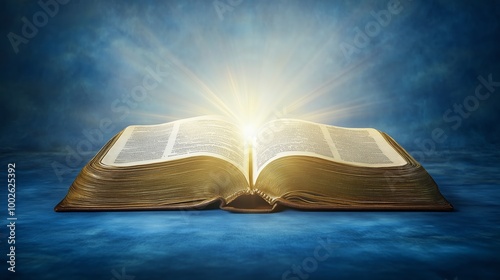 An open book emits a radiant glow against a blue background, symbolizing knowledge and enlightenment in a serene setting