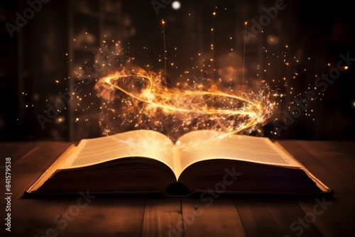book, open, glowing, magic, particle, mystical, enchanted, light, swirl, sparkle, fantasy, mysterious, page, line, spell, library, wooden, table, cognition, wisdom, literature, aura, supernatural, gold, fiction, atmosphere