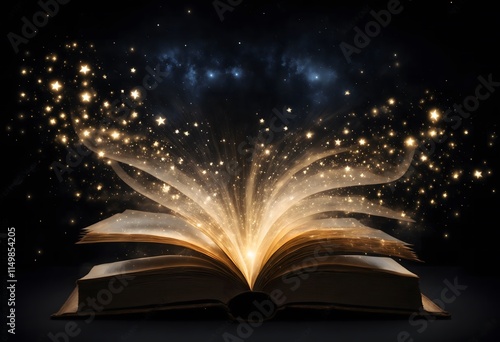 An open book with glowing pages, glowing stars and lights coming out of the book, black background