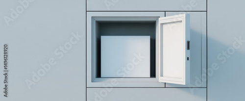 An open security deposit box is embedded in a wall with its door ajar, revealing an empty interior. Concept: Security and storage