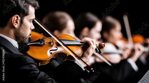 An orchestra in mid-performance, with violinists absorbed in their art, creating harmonious soundscapes.