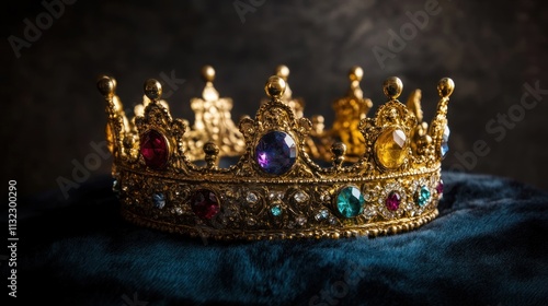 An ornate gold crown encrusted with colorful jewels, set against a dark velvet background..