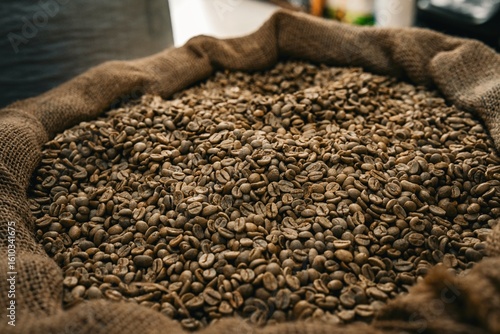 An overflowing burlap sack filled with freshly harvested coffee beans, showcasing richness and texture. Ideal for conveying themes of coffee production, agriculture, and organic ingredients.