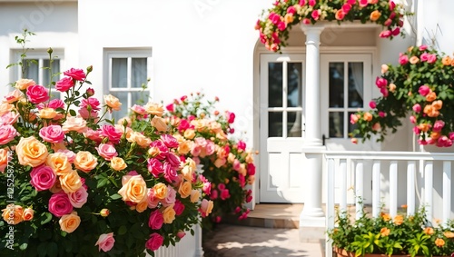 An straight-perspective, middle-angle photograph shows passing gallery covered in multicolored roses in full bloom against a clean, brilliant white painted house.