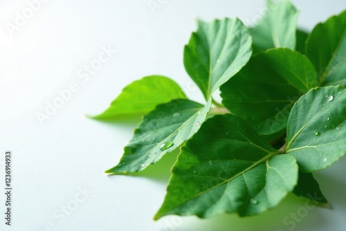 Anacardium occidentale leaves with dew drops or moisture visible on a clean white surface, natural, plant leaves, botanicals