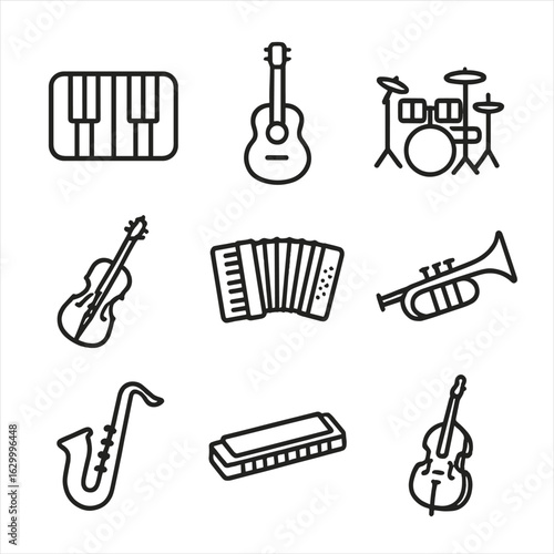 analog, instrument, icon, outline, icon, set, musical, instrument, piano, keyboard, acoustic, guitar, drum, fiddle, accordion, trumpet, saxophone, harmonica, double, bass, line, only, black, colours, consistent, stroke, weight