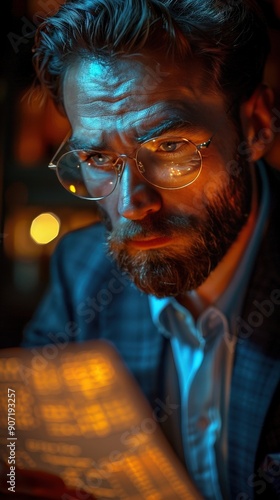 corporate, quarterly, man, glasses, read, document, low, light, showcase, determination, sharpened, professional, risk, report, asset, statement, depth, work, fund, review, male, tax, debt, investor, cost, suit, profit
