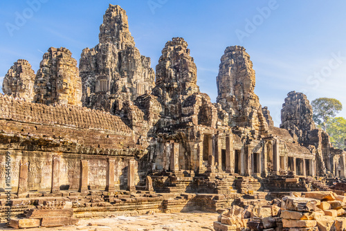 Ancient Bayon temple with carved stone faces, Angkor Thom, Siem Reap, Cambodia