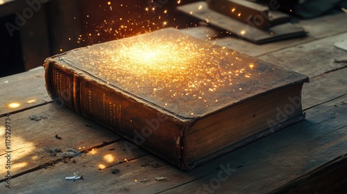 book, ancient, magic, spark, gold, glowing, old, leather, wooden, table, mystical, fantasy, illumination, light, cognition, wisdom, mystery, power, energy, secret, history, lore, page, text, story, legend, myth, tale, antique, vintage, dusty, worn, timeless, powerful, illuminated, radiant, fire, ember, glow, bright, dark