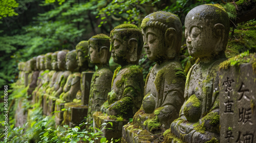 Ancient Buddhist Stone Statues in Japan. A row of weathered stone statues of Buddhist deities, covered with moss, set in a lush green forest. A peaceful and spiritual heritage site in Japan.