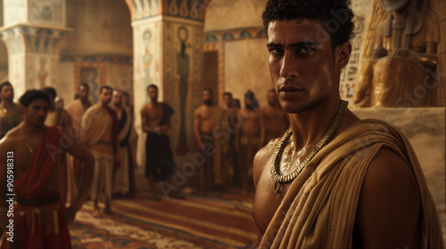 Ancient Egyptian nobleman in ornate palace. Shirtless man wearing gold necklace and draped robe. Hieroglyphics on pillars and crowd of people in the background with atmospheric lighting.