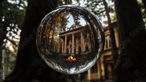Ancient mansion reflected in a crystal ball with campfire in a forest setting Reflection of an old, classical mansion surrounded by trees through a glass sphere with a campfire in the forest