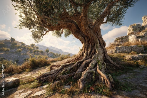 olive, tree, ancient, old, root, hillside, rocky, mountain, landscape, nature, sky, cloud, trunk, branch, leaf, green, brown, texture, weathered, gnarled, scenic, outdoors, sunlight, grass, plant, vegetation, hill, stone, rock, environment, rural, countryside, background, vista, panorama, view, summer, spring, day, light, shadow, detail, bark, growth, natural, beauty, peaceful, serene, calm