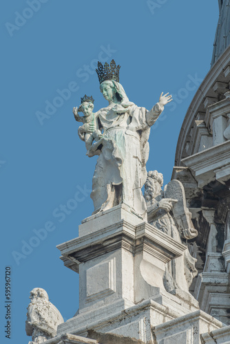 Ancient sculpture of beautiful Venetian Noble Renaissance Era woman with child at Basilica di Santa Maria della Salute in Venice, Italy, at blue sky