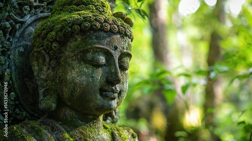 Ancient stone Buddha statue covered in moss in a forest temple