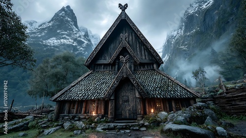 Ancient Viking longhouse nestled in misty, snow-capped mountains