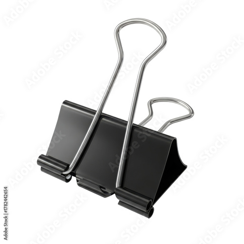 Angled view of a black binder clip, a versatile tool for organizing documents and papers in any office or home setting, isolated on transparent background its strong grip