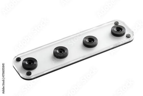 Angled View of Clear Acrylic Plate with Four Black Rubber Grommets on Transparent Background for Technical Component, PNG