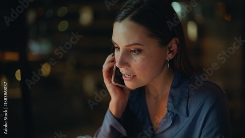 Angry ceo talking smartphone at night office closeup. Worried woman calling