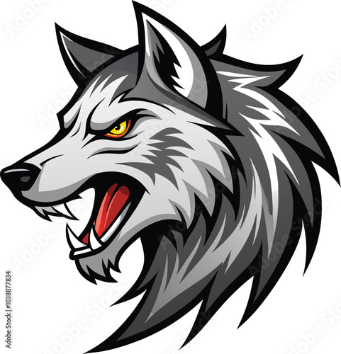 wolf, head, mascot, illustration, design, angry, menacing, expression, sharp, teeth, mouth, intense, yellow, eye, white, background, cartoon, animal, wild, predator, canino, furry, grey, black, red, vector, art, graphic, logotype, symbol, icon, sport, team, brand, business, nature, wildlife, power, strength, ferocity, determination, spirit, leadership, agility