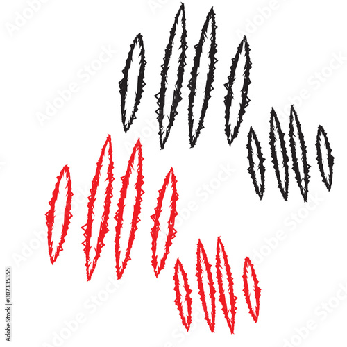 Animal claw scratches and marks. Set. Black and red bloody silhouettes and outline. Icon, flat. Vector isolated on white background. Scratches from a cat, tiger, lion, dog, jaguar, bear, puma, leopard