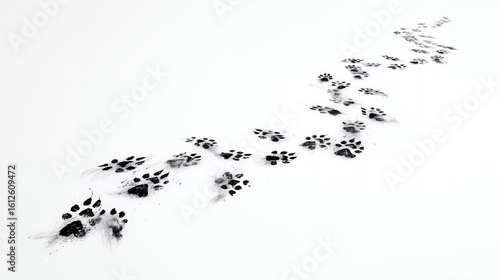 Animal paw prints on a white snowy surface creating a path, concept for winter wildlife tracking, animal behaviour research and snow adventure.