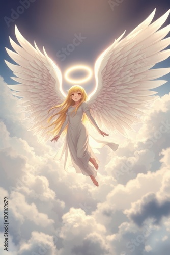 Anime style angel floating in the sky, blonde hair, large wings and glowing halo. White clouds background.