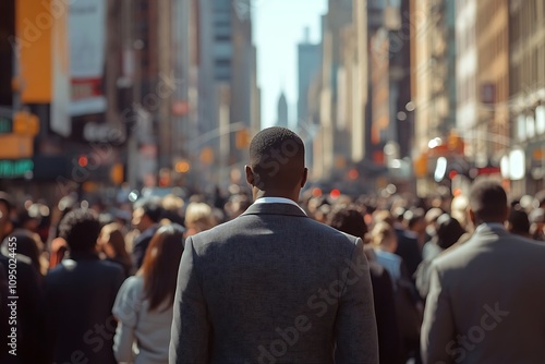 city landscape, city street, skyscraper, business district, crowd, people, pedestrian, rush hour, commuting, anonymous, backview, suit, businessman, professional, man, male, dark-haired, african american, city life, metropolitan, blurred background, depth of field, urban setting, modern architecture, city landscape, manhattan, new york city, business attire, street scene, walking, daytime, shadow, perspective, individual, loneliness