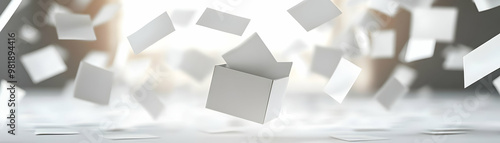 Antigravity Ballot Drop Concept: Close-Up of Ballots Rising into Floating Box Defying Gravity, Emphasizing Vote Importance - Isolated on White Background