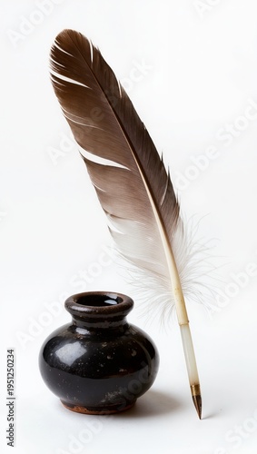 Antique feather quill pen with ink pot isolated on white background. Vintage writing tool with brown feather and old ink bottle, concept of calligraphy, literature, history and creativity.