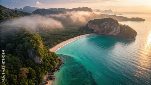 Ao Nang Beach Island Cliff Seascape Krabi Thailand Andaman Sea Travel Vacation Breathtaking aerial view of a serene beach surrounded by lush greenery and misty mountains.