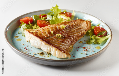 Appetizing fried fish fillet with mixed leaves and cherry tomatoes