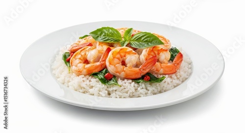 Appetizing Shrimp Rice Basil Dinner Entree on Bright White Background Food Photography