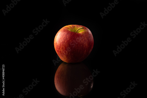 Apple, a beautiful red apple on reflective surface, black background, selective focus.