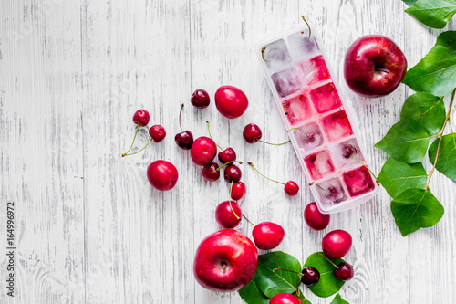 Apple, pulm, cherry, ice for summer fruit drink on wooden table background top view copyspace
