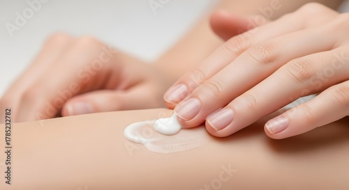 Application of moisturizer on skin with fingers spreading the lotion in a circular motion on arm