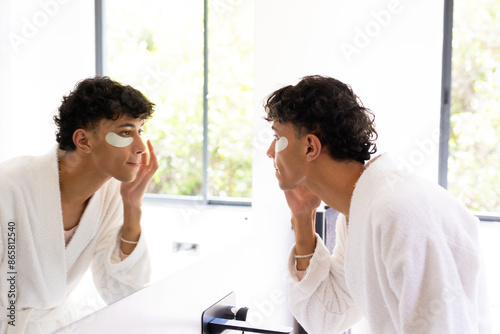 Applying under-eye patches, young man in bathrobe looking in bathroom mirror